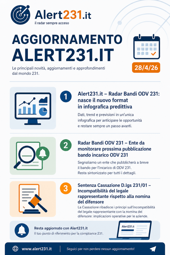 Su Alert231.it sono disponibili due aggiornamenti rilevanti per chi opera nell’ambito della compliance e dell’Organismo di Vigilanza 231.