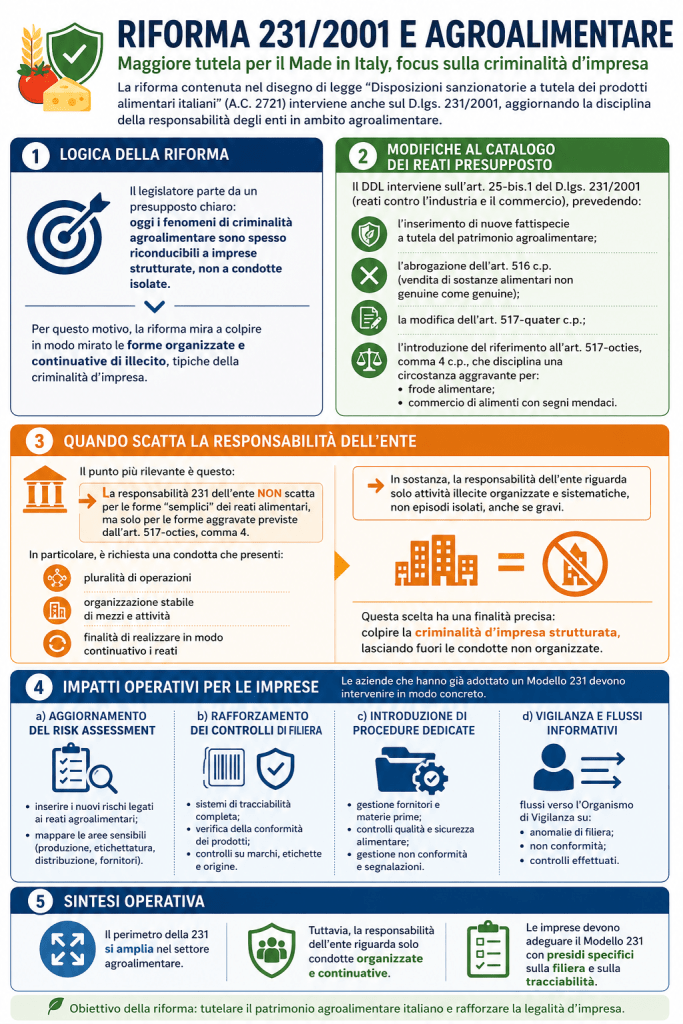 La riforma contenuta nel disegno di legge “Disposizioni sanzionatorie a tutela dei prodotti alimentari italiani” (A.C. 2721) interviene anche sul D.lgs. 231/2001, aggiornando la disciplina della responsabilità degli enti in ambito agroalimentare.