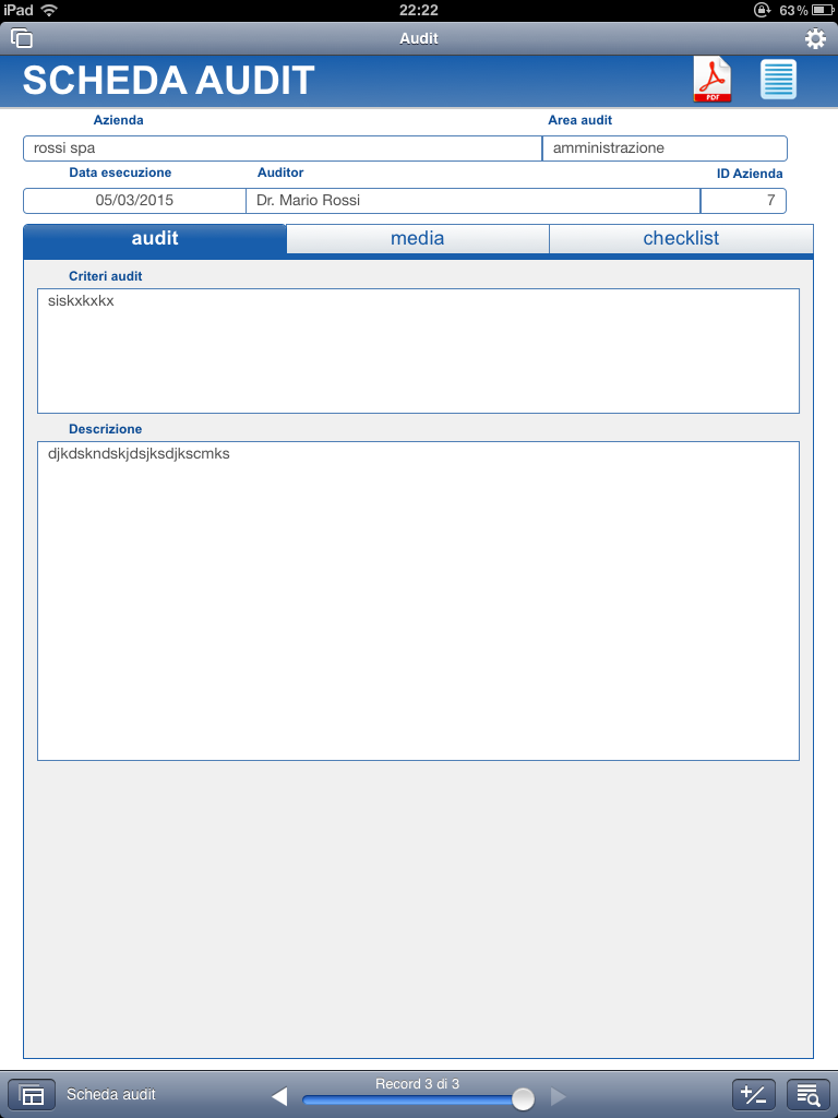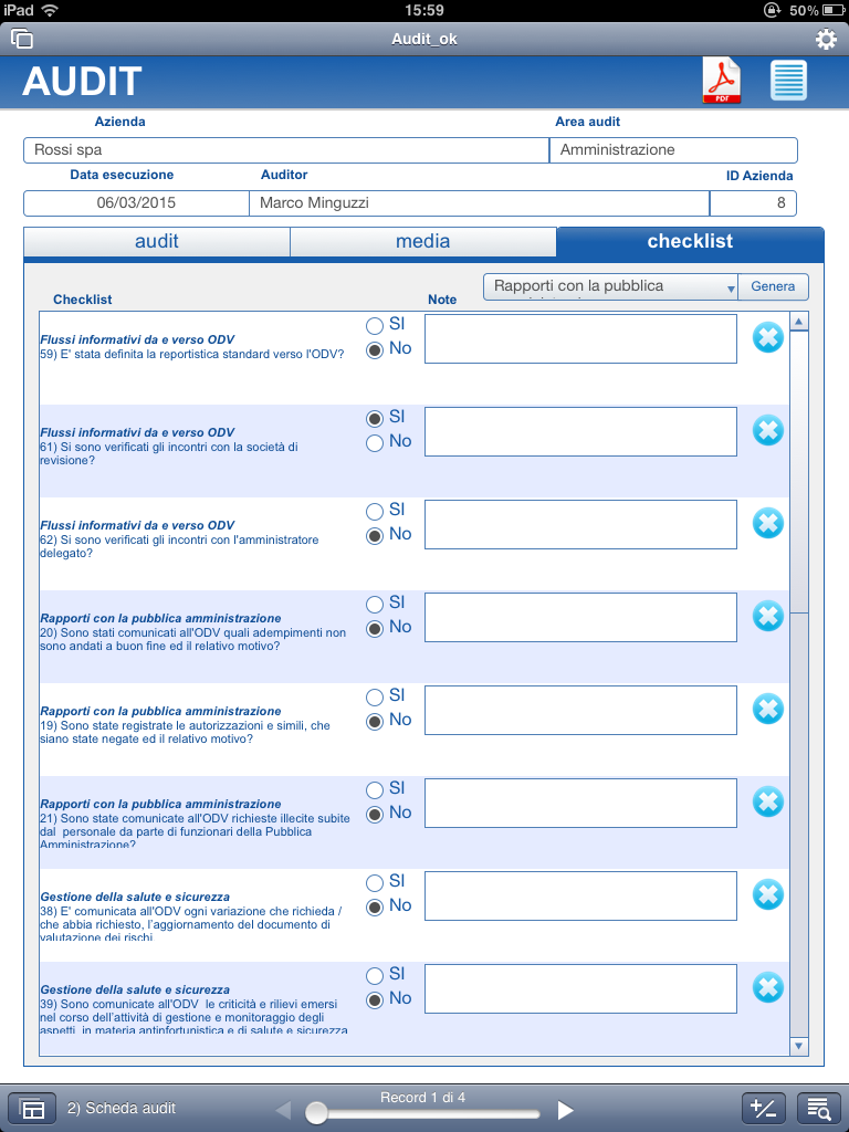 1) Audit 231, dove l’utente può registrare tutte le informazioni relativi agli audit di verifica, allegare foto, video, firme, utilizzare check list (precaricata) per individuare gli aspetti critici e sanzionabili del modello 231. Il software per ogni attività di audit genera due report in pdf: uno con i dati di analisi basati sulla check list e un altro con le immagini e le firme inserite.